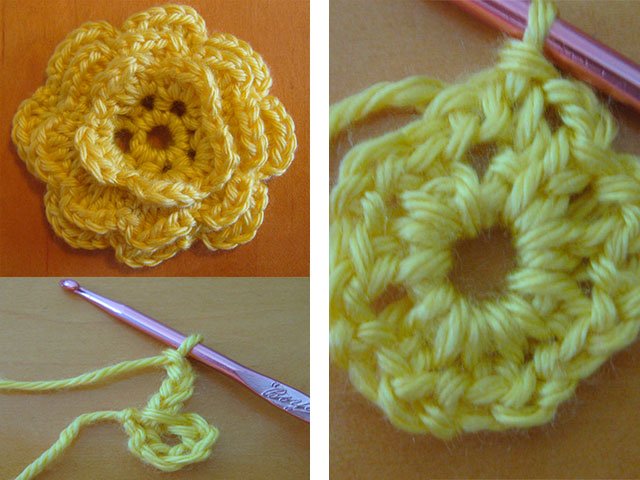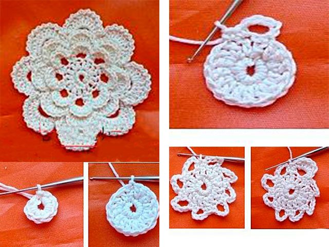 Faisons une autre fleur volumineuse. Il sera différent du précédent en ce qu'il sera en couches. Pour lui, nous avons pris un fil plus fin et un crochet plus petit.