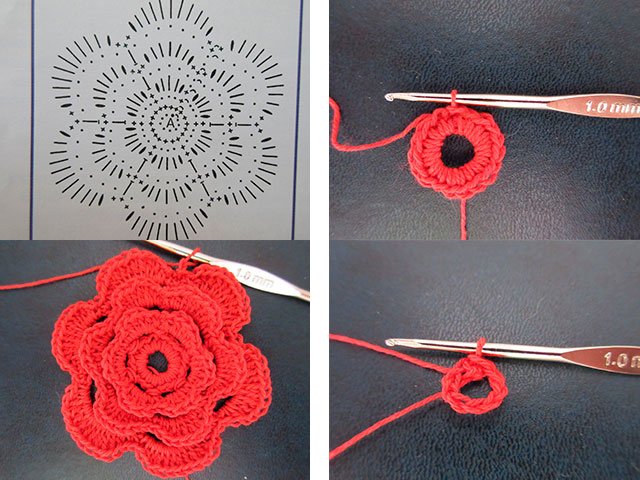Le plus souvent, les fleurs volumineuses le deviennent en tricotant avec colonnes luxuriantes. Comment le faire correctement - vous allez apprendre maintenant! Ainsi, une fleur aux pétales luxuriants commence par le choix d'un crochet (nous avons le numéro trois) et d'un fil (rouge, 100% coton).