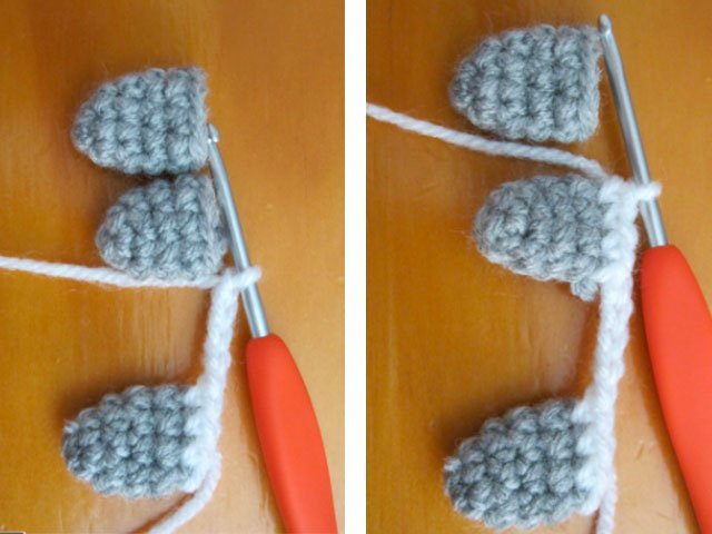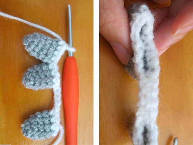 Deux oreilles grisé: 3 S.B.N. dans l'anneau d'amigurumi, 2 S.B.N. dans chaque S. B.N.