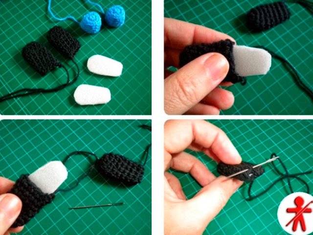 Nous allons faire les fils de couleur noire des chaussures: 6 V.P. dans le ring. P.R. 6 fois, 12 S.B.N. (toutes les 3 et 4 rangées), 4 S.B.N. + WB 2 fois. Du sixième au neuvième rangs de 10 S. B.N. Ensuite, cousez la jambe en bleu directement sur la chaussure. Nous collectons dessus 12 S. B.N., 3 S. B.N., P.R. 3 fois et 15 S.B.N. dans la dernière cinquième ligne.
