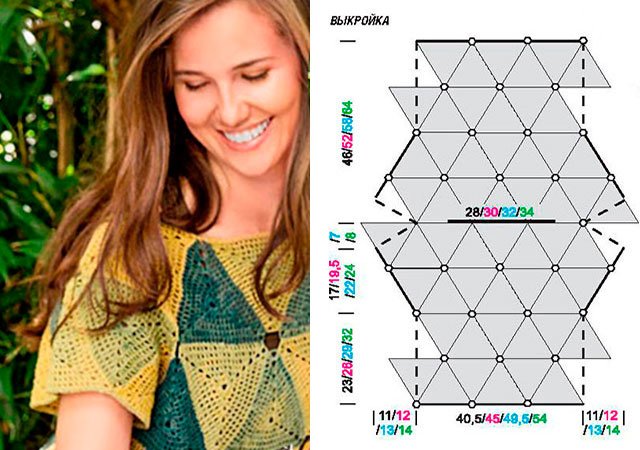 Tricot tous les éléments selon le schéma. Pour le produit dont vous aurez besoin 27 triangles pour devant pièces et la même chose pour retour. Total: 54 triangles. Vous pouvez les connecter de différentes couleurs, vous pouvez en choisir un ou deux. Ensuite, ils doivent être cousus les uns aux autres. Mais il est préférable de laisser le fil à la fin (1 m) après avoir cousu tous les éléments ensemble et d'attacher toutes les pièces avec lui. Décolleté, manches et en bas attacher S.B.N. + 1 V.P.