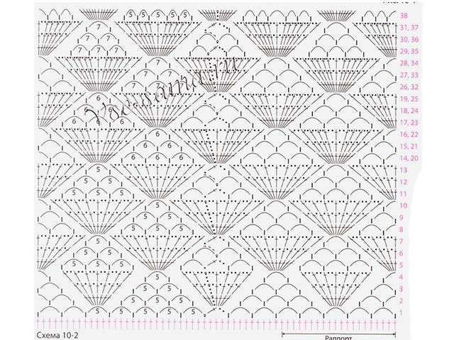 Donc notre futur t-shirt à bretelles Tricots dans une toile continue. Commence avec top futurs T-shirts: 200 V.P. dans le ring, 3 V.P. pour soulever. Suivant circulaire R. de S.S.N. Ainsi, commencez chaque nouveau R. - avec 3 V.P., et terminez-le avec l'aide de S.S. Lorsque vous faites 8 centimètres S.S.N. - Tricoter sur C / X 10 - 1 (exactement quarante rapports). Maintenant la partie inférieure selon le schéma 10-2. La toile en largeur doit pouvoir recevoir 10 rapports du motif. L'ordre suivant vous aidera à rester sur la bonne voie: répétez 1 fois 14 à 19 R., puis 1 fois 26 à 31 R.