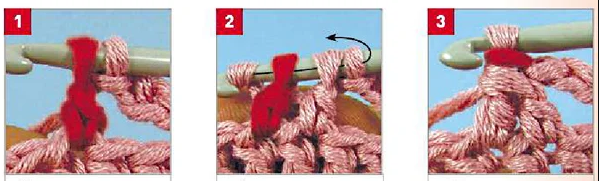 Dans chaque haut de la rangée précédente, nous avons tricoté 1 crochet double.