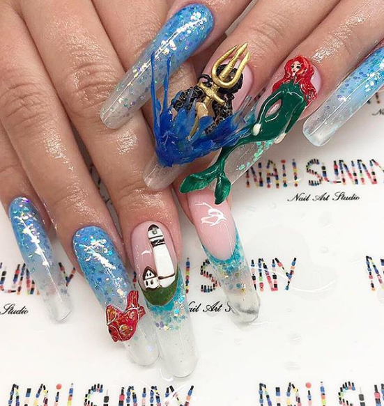Quelle fille dans les rêves d’enfance ne s’imaginait pas une princesse ou une sirène? Peut-être qu'il est temps de diluer la vie quotidienne grise avec des silhouettes brillantes et juteuses sur les ongles? Certes, vous devriez immédiatement trouver une femme de ménage et un styliste, car vous ne pouvez pratiquement rien faire d'utile avec de tels clous.