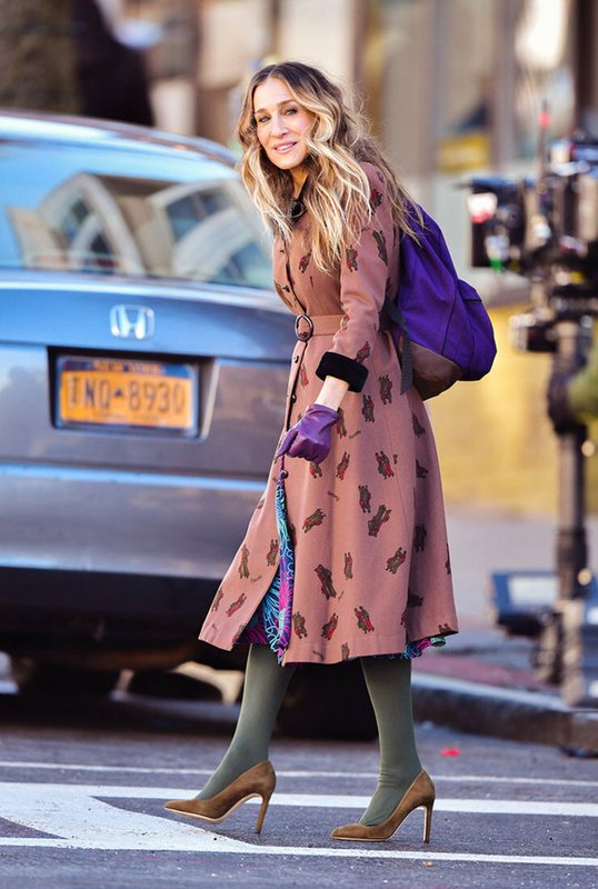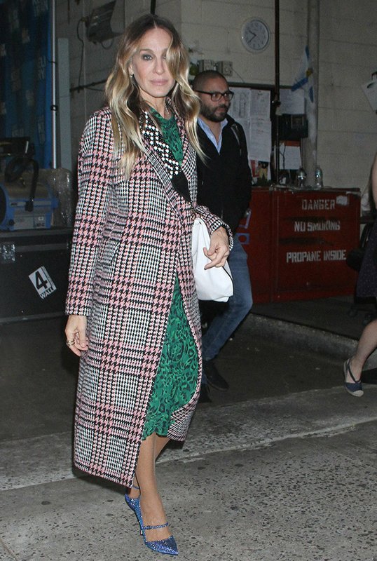Sarah Jessica Parker combine cet imprimé à la mode avec une robe couleur émeraude et des bateaux chatoyants.