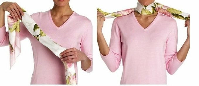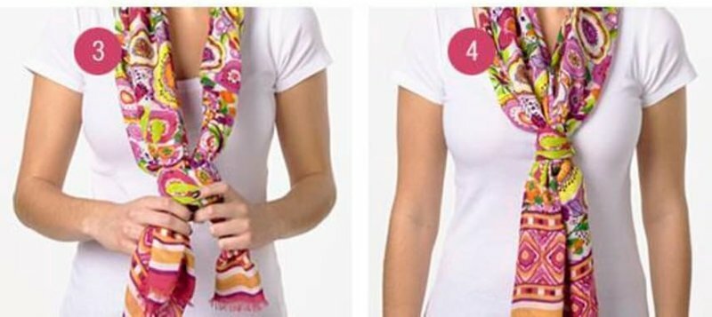 Étape 1 et 2. Pliez plusieurs fois un foulard en soie en deux fois et jetez-le sur le cou. À une extrémité, nous faisons un noeud faible. Passez l'extrémité libre du tissu à travers le nœud obtenu.