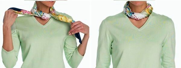 Cette méthode de nouer une écharpe souligne favorablement le décolleté et complète l'image d'une jeune fille.