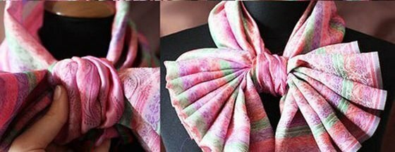 Pour la pratique, vous aurez besoin d’un long châle ou d’une étole en soie épaisse ou en satin. Utilisez le tissu recommandé dans des couleurs vives. Ainsi, le nœud «Bow» sera plus élégant et plus beau.