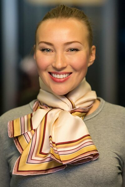 Étape 1 Un petit foulard en soie est plié en une longue bande étroite et se porte autour du cou.