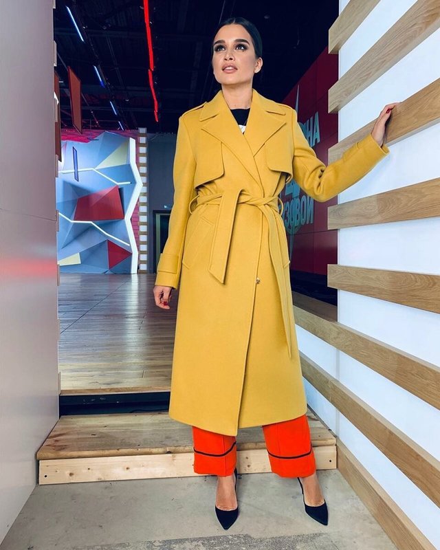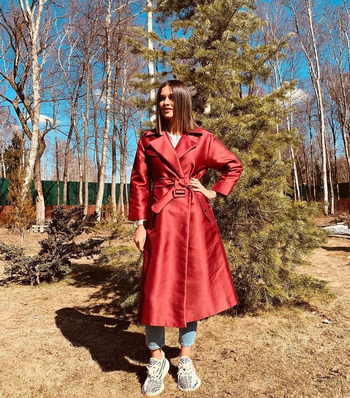Et enfin, un exemple d'arc qui perd clairement toutes les options ci-dessus. Un trench-coat en matériau brillant, et même dans cette couleur a l'air rustique.De plus, les femmes qui sont moyennes ou grandes doivent porter des vêtements d'extérieur longs avec des baskets, sinon vous pouvez ajouter quelques kilos supplémentaires visuellement et emporter de précieux centimètres.