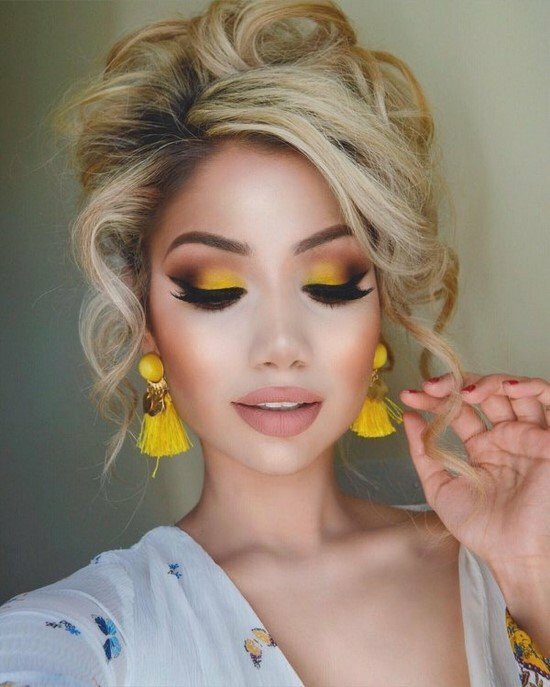 Le maquillage des lèvres peut être brillant et plus calme. Brunettes aux yeux sombres peuvent se permettre spectaculaire rouge à lèvres couleurs fuchsia ou rubis. Les filles aux cheveux blonds moins foncés peuvent expérimenter des nuances de rose ou d’orange.