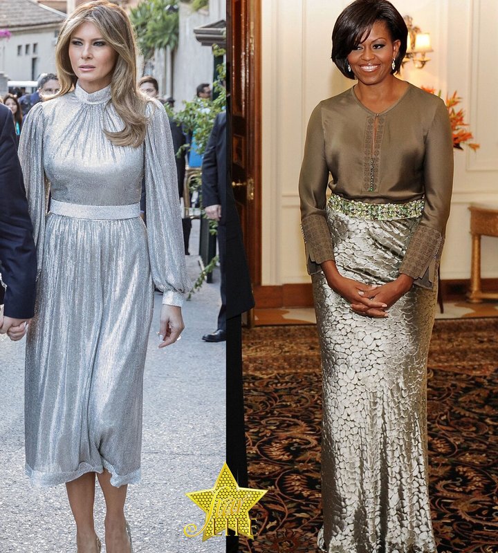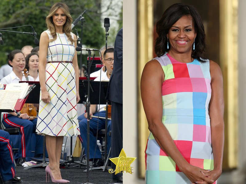 En fait, chaque première dame préfère des empreintes similaires. Ou peut-être qu'ils ont un styliste? Dans tous les cas, Michelle Obama et Melania Trump portaient une robe avec un imprimé à carreaux de couleur.