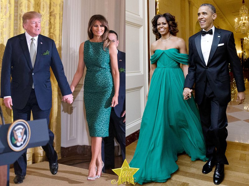 La couleur émeraude est certainement la nuance parfaite pour Michelle Obama. Dans une ravissante robe de bal de couleur verte, elle a l'air tout simplement à couper le souffle. Mais Melania, qui préfère les styles classiques stricts, ne s’est pas trahie en choisissant une robe fourreau à deux tons de vert.
