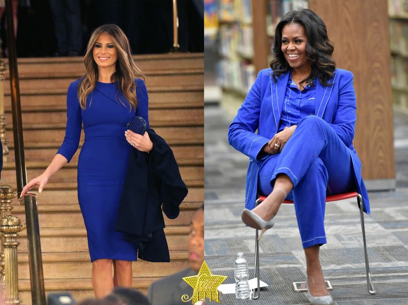 Comment gérer les femmes si importantes dans le monde de la politique sans teinte bleu royal. Robe bleue stricte, soulignant la silhouette de Mélanie, très féminine. Bien sûr, vous ne pouvez pas ignorer l'élégant costume de Michelle, qui s'intègre parfaitement dans n'importe quel cadre et événement.