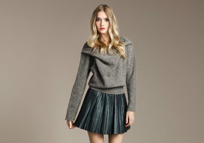 Pour une allure décontractée, vous avez le choix entre une jupe courte en faux cuir plissé et un pull chaud avec un col personnalisé. Un style similaire peut être utilisé pour les promenades à la journée, les dates, même en assistant à des conférences.
