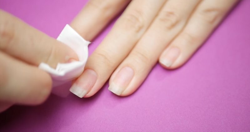 Une manucure avec gomme laque à la maison à ce stade est considérée comme presque complète. Il reste à enlever la couche collante. Ceci est fait avec un dégraissant et un coton non pelucheux.