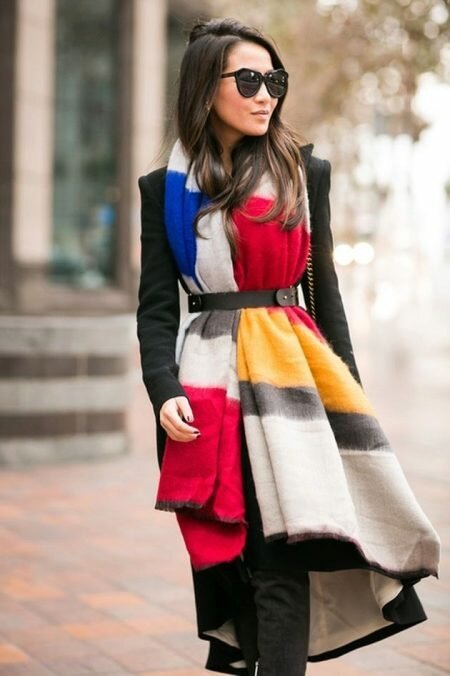 Beaucoup de fashionistas décident d'attacher une longue écharpe avec une ceinture. La solution est nouvelle et inhabituelle, mais elle est très élégante.