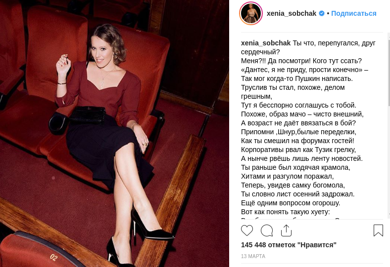 Eh bien, la première confirmation du roman de Ksenia et Bogomolov n’était même pas une publication conjointe, mais des vers que la star blonde dédiait à Sergei Shnurov. Là, elle s’appelait une «mante religieuse féminine», ce qui a clairement plu aux fans qui ont assisté à l’escarmouche «intelligente» sur le net.
