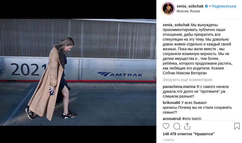 Mais les fans d'une telle déclaration se sont révélés peu nombreux et beaucoup ont continué à croire que le couple parviendrait toujours à établir des relations. Le dernier point de l’histoire a été présenté par Ksenia, qui a publié le 8 mars des informations sur la séparation officielle de son mari.