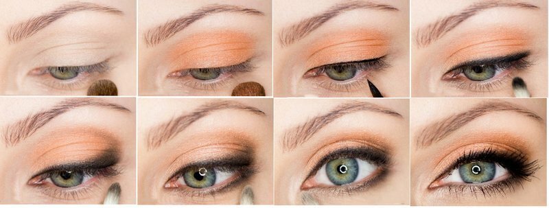 Ces couleurs peuvent donner à l'image un aspect fatigué si les yeux ne sont pas verts purs, mais mélangés avec une nuance bleue ou ambre. Pour ceux-ci, il est recommandé d'utiliser une palette chaude de nuances de chocolat doré et brun saturé. Pour le maquillage de jour, les couleurs orange, beige et pêche conviennent.
