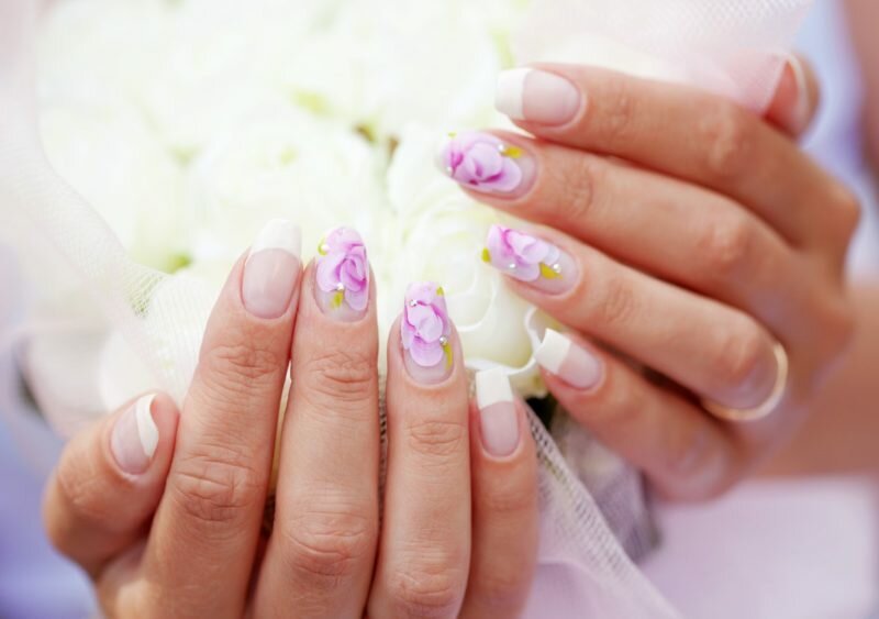 Les dessins utilisés dans les manucures de mariage sont principalement floraux.Dans ce cas, les fleurs peuvent être plates, dessinées ou fabriquées à l'aide de timbres, ou volumétriques dans la technique 3D.