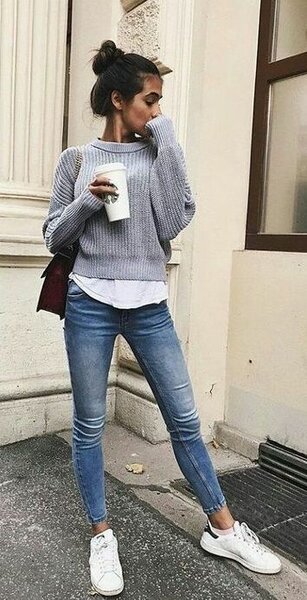 Les jeans skinny solides avec une taille haute et des bords bruts sont un modèle très actuel. Les porter avec un top tendance est le meilleur: