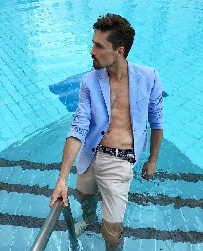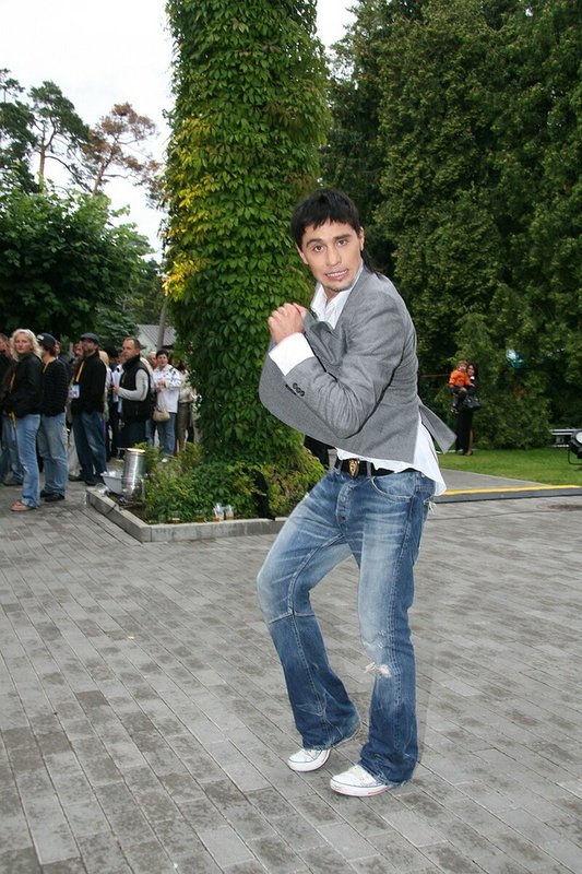 Dans cette image, il est resté longtemps, mais avant le prochain voyage au célèbre concours de chansons, il choisissait toujours un style encore plus attrayant pour les femmes. Cheveux noirs (oui, il a été repeint) et ensemble de plage - pieds nus et en blanc.