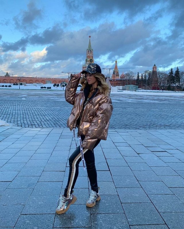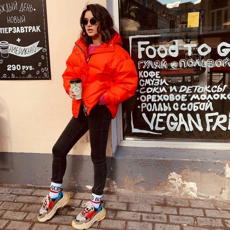 Ksenia Borodina porte des baskets laides à la mode avec une veste en duvet raccourcie non moins élégante.