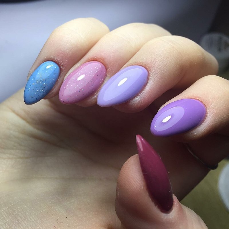 L'idée de peindre tous les ongles dans différentes nuances de la même couleur n'est pas nouvelle, mais très élégante. Il est préférable de couvrir le pouce avec la couleur la plus sombre et d'aller à la lumière.