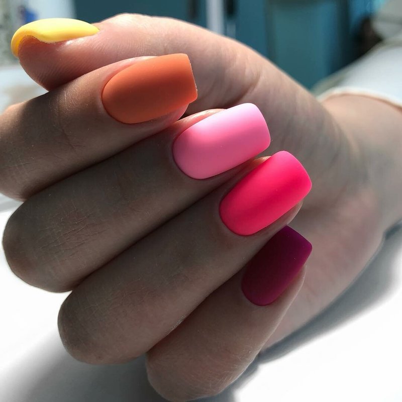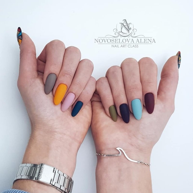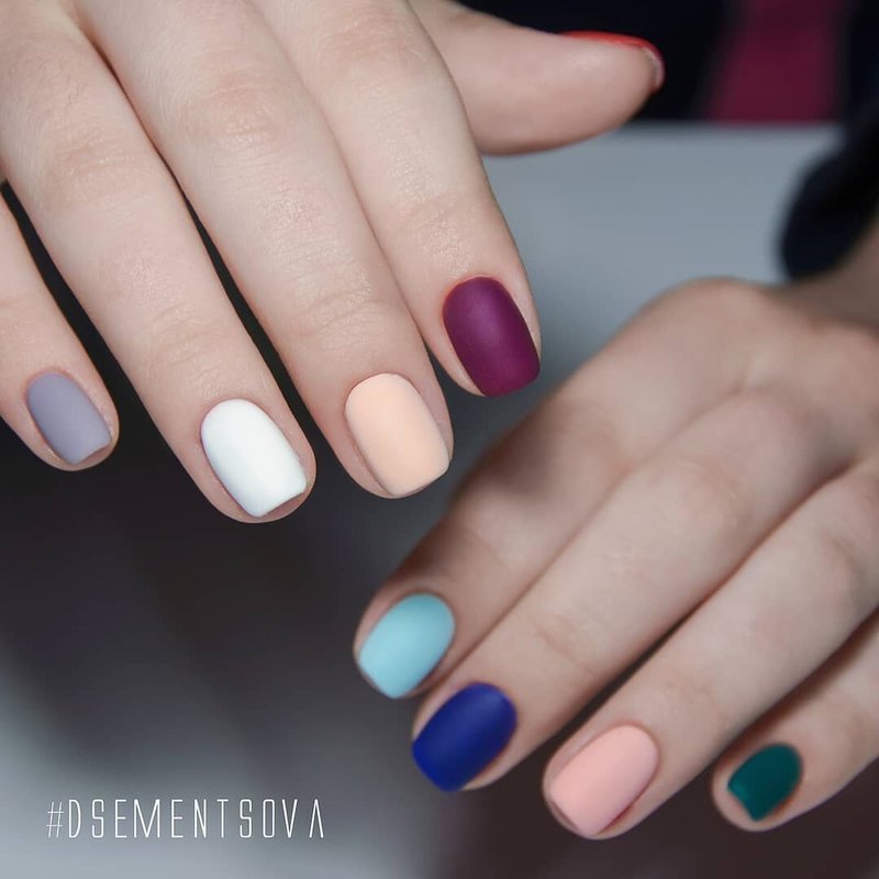 Les ongles mats colorés, lorsque des vernis de nuances apparentées sont sélectionnées, ne sont pas pires que ceux brillants. La principale chose à retenir est qu’il est beaucoup plus facile de gâcher une telle manucure, il est donc préférable de porter des gants pendant la cuisson.