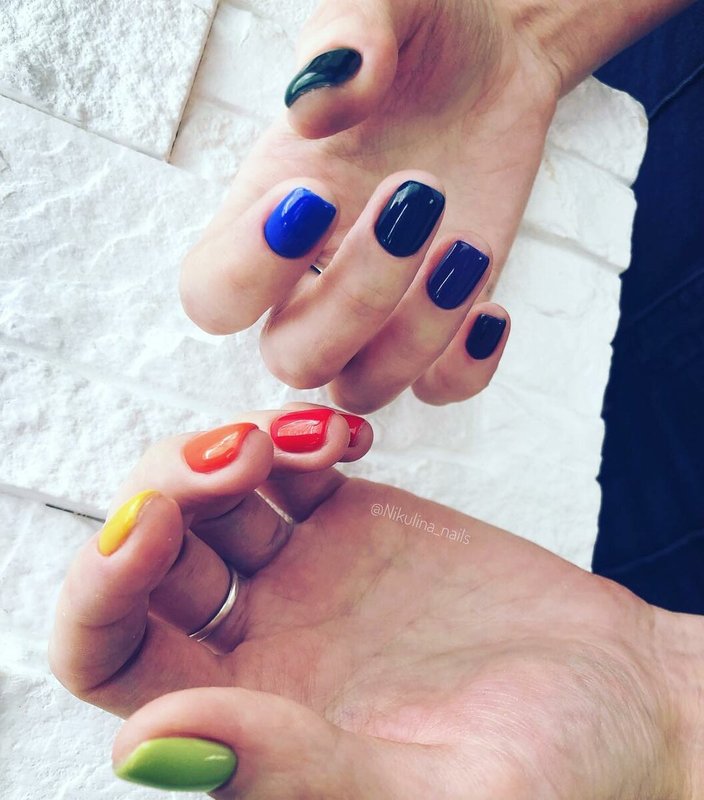 Quelqu'un dira que la manucure multicolore ne tolère pas les règles et que vous pouvez peindre vos ongles avec n’importe quelle couleur, mais vous devez l’avouer, vous regardez parfois les mains sans comprendre comment vous pouvez le faire, et parfois il est impossible de détacher les yeux de vos doigts, donc tout est harmonieux.
