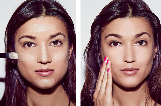 Étape 2. Lorsque la crème hydratante est absorbée, vous pouvez commencer à appliquer le fond de teint. Nous sélectionnons la teinte du produit cosmétique en fonction de la couleur de la peau. Utilisez une brosse spéciale pour appliquer le tonalka sur le front, les joues, le dos du nez et le menton. Ombrez bien.