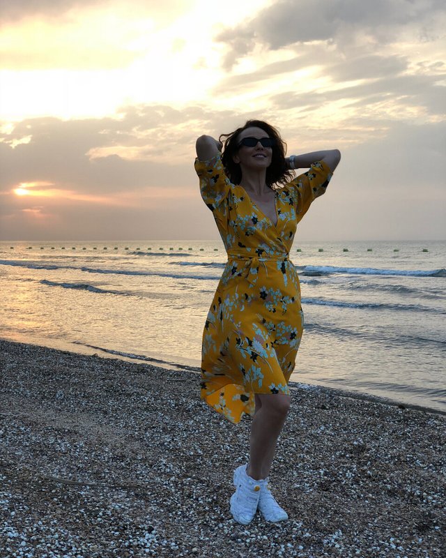 Sur la plage, Dzhanabaeva préfère porter un maillot de bain à la mode avec un haut qui protège du soleil, car prendre un bain de soleil est très nocif.