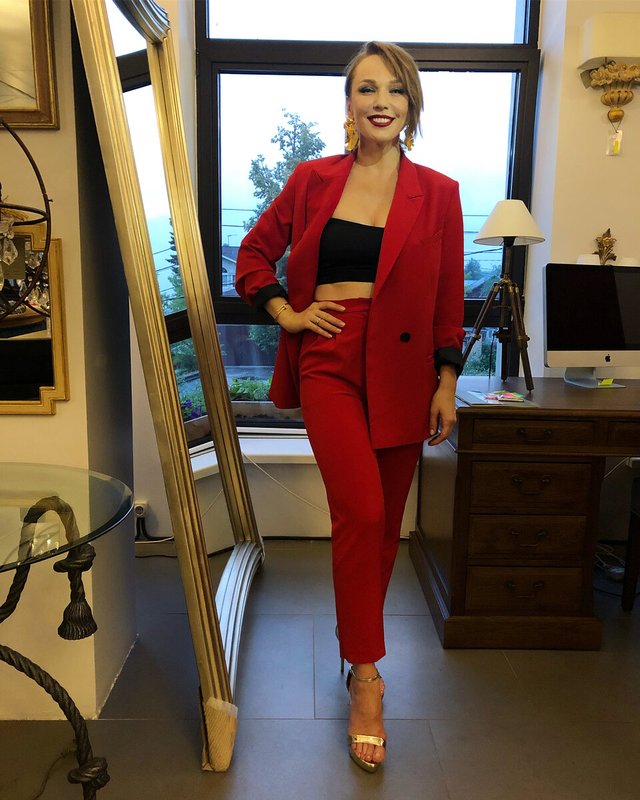 Albina a une belle silhouette, les sommets sont donc souvent présents dans ses images. Elle les adapte harmonieusement dans un tailleur-pantalon. Et cela est maintenant très pertinent.