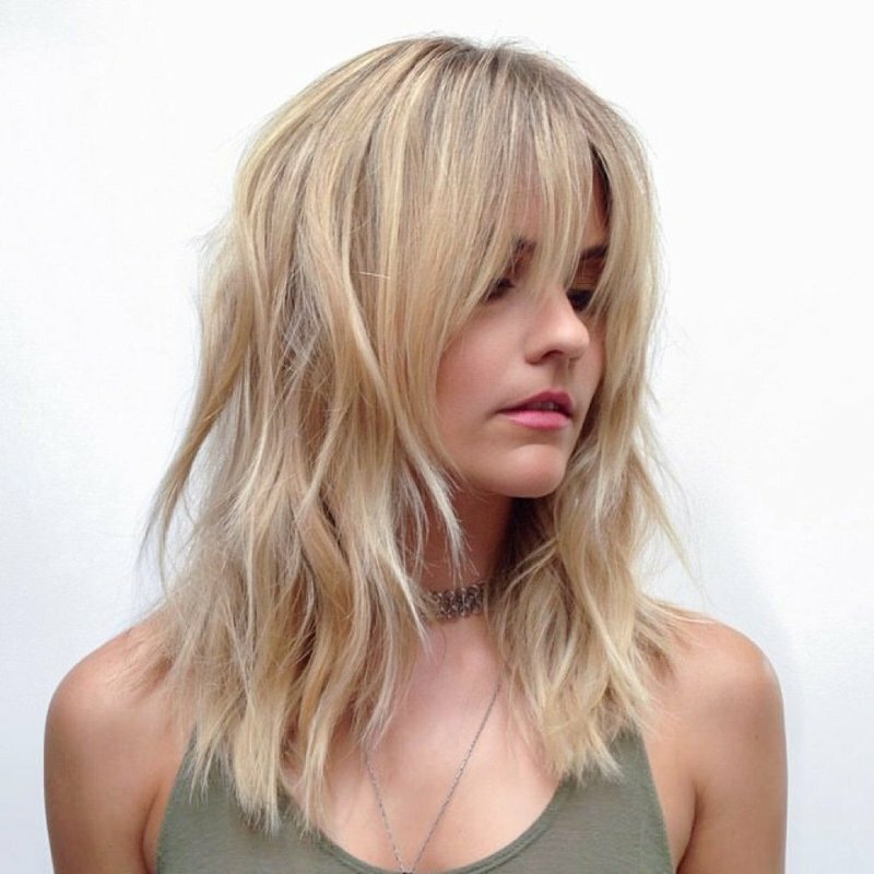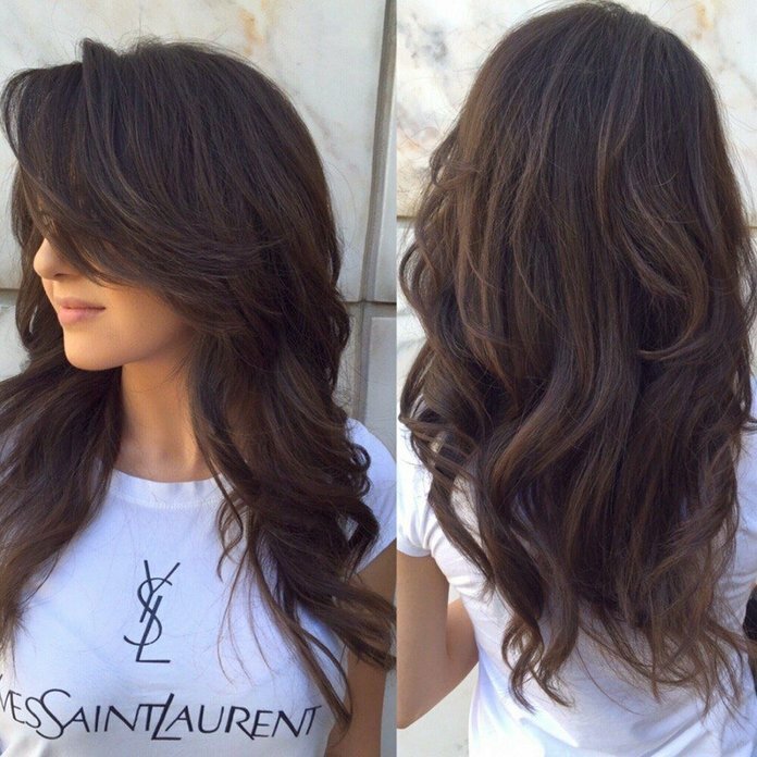 Frange déchirée couplé avec une coupe de cheveux en cascade pour les cheveux longs - une bonne solution si les cheveux sont bouclés. La pose prendra un minimum de temps, et ceux qui vous entourent auront l’impression que vous venez de quitter le salon.