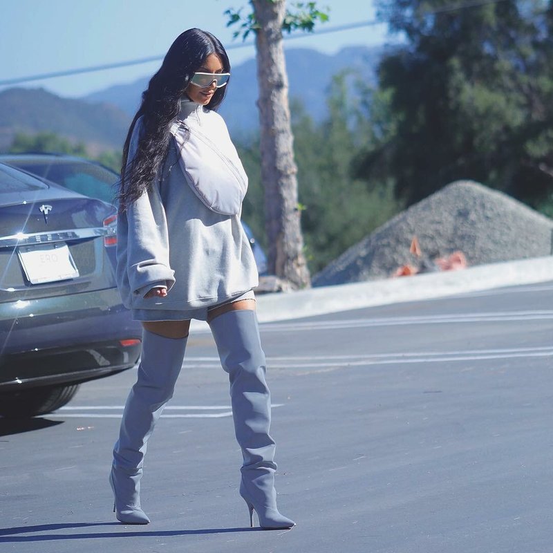 Si Kim choisit un sweat-shirt ample pour ne pas perdre sa sexualité, vous ne pouvez pas porter de pantalon. Des bottes en daim sur le genou complèteront parfaitement le look. À propos, ce style de célébrité a été adopté par beaucoup de nos stars nationales - Natalia Rudova, Lena Temnikova, Olga Buzova.