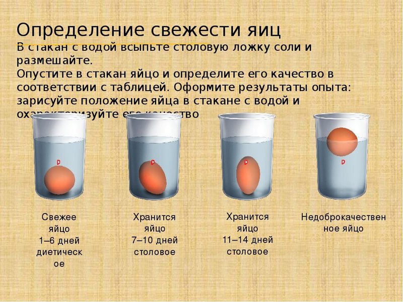 La fraîcheur des œufs est très facile à déterminer: trempez-le dans un bol d'eau. Plus l'œuf est frais, plus il baissera. Un oeuf éventé va apparaître.