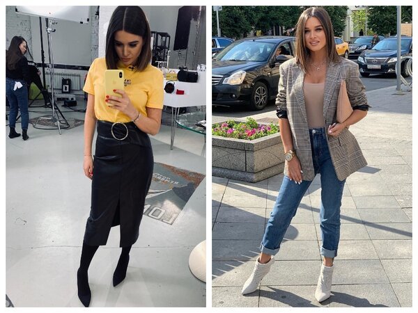 Aussi cette saison sont considérés comme extrêmement à la mode. bottines blanches et bottes de cosaque. Ksenia les a combinés à un jean tendance et à une petite veste à carreaux allongée. Super look d'automne!