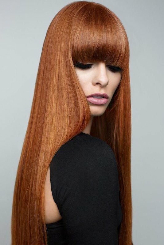 Coupe de cheveux à plat les cheveux longs avec une frange uniforme convient à presque tout le monde. Une telle coiffure conviendra avantageusement aux filles blondes et aux filles noires. La longueur de la frange peut être courte, moyenne ou allongée.