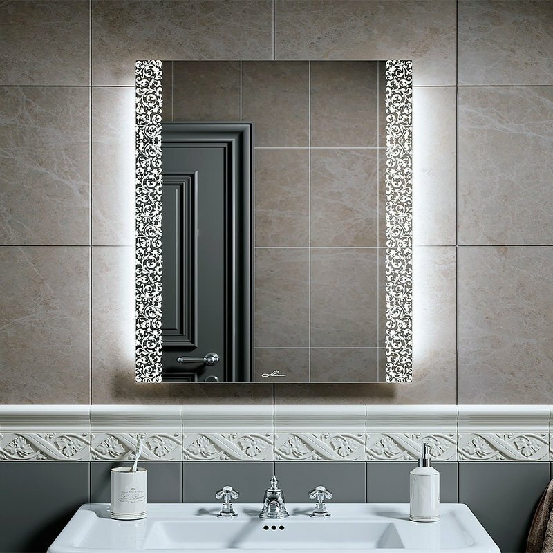 Miroir avec éclairage décoratif, dont l’éclairage ne porte pas de fonction particulière lors de l’application du maquillage. L'objectif principal de ce type est une décoration décorative non standard. Les lampes sont situées à l'intérieur et à l'extérieur du verre.